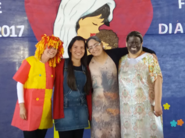 Professoras que participaram do teatro: Cássia como Visconde, Gabriela como Narizinho, Juliana como príncipe das águas claras, Jovana como princesa Iara e Gisele como Pedrinho e o padre.